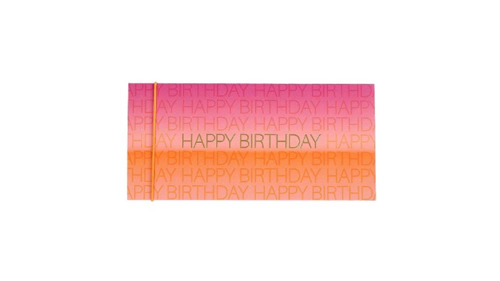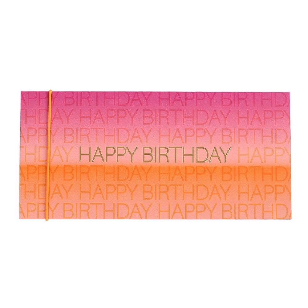 Ez a vidám, színes ajándékutalványtartó élénk, rózsaszíntől narancssárgáig terjedő színátmenetet kínál, finom „Happy Birthday” felirattal kiegészítve.
