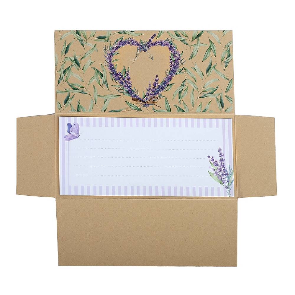 Finom pasztellszínekkel, levendula virágokból formázott szív motívummal díszített ajándékutalvány tartó.