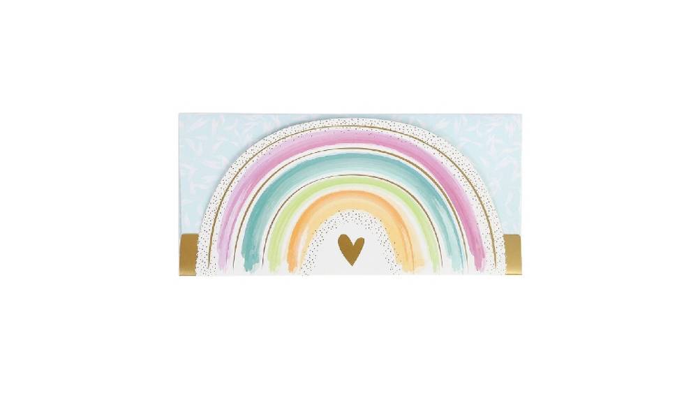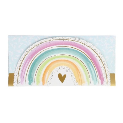 Finom, pasztellszínű, szivárvány motívummal díszített ajándékutalvány tartó.