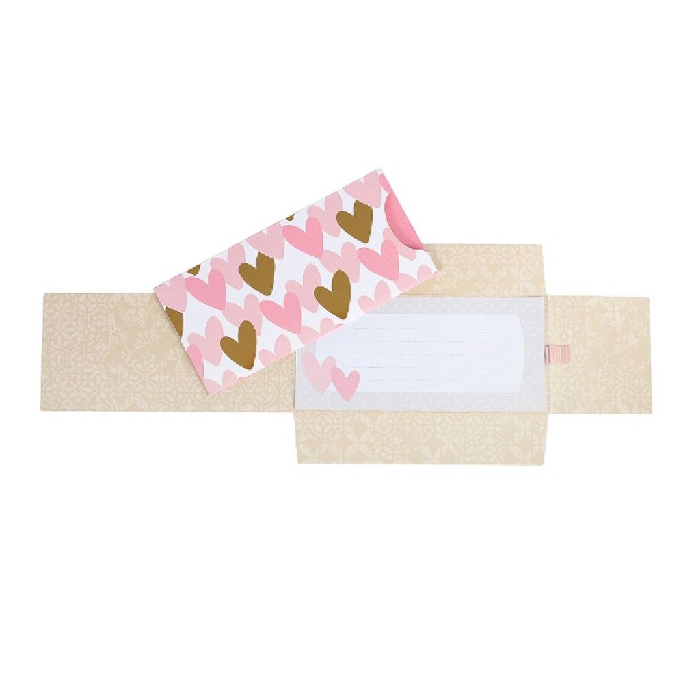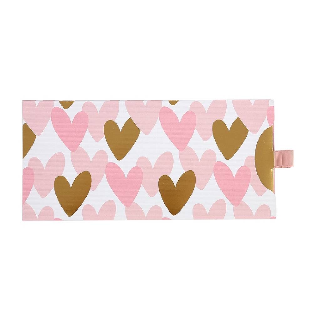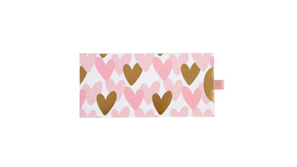 - Kellemes pasztell színvilágú, rózsaszín és arany szívekkel díszített ajándékutalvány tartó