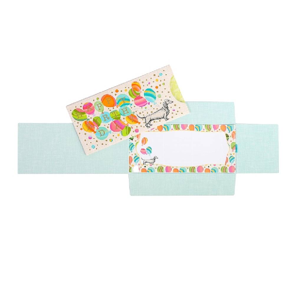- Vidám, Happy Birthday felirattal és színes lufikkal díszített ajándékutalvány tartó