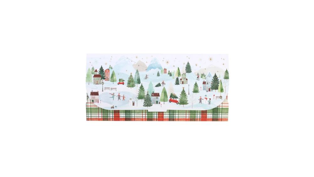 - Egy kis téli varázslat az pénzajándékokhoz: a „Winter Village” ajándékborítékot szeretettel megrajzolt házak, hóval borított fák és kis figurák díszítik, akik korcsolyáznak, hóembert építenek vagy ajándékokat szállítanak