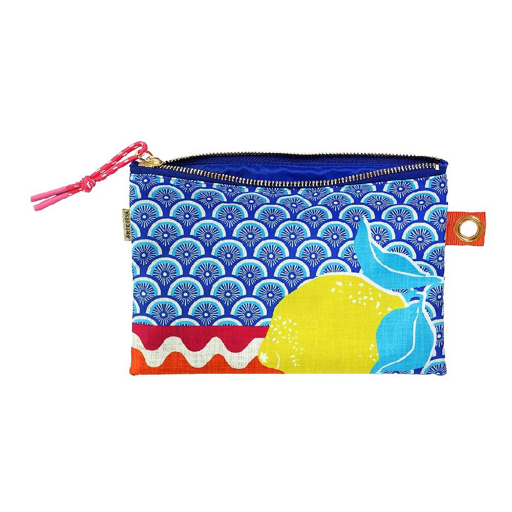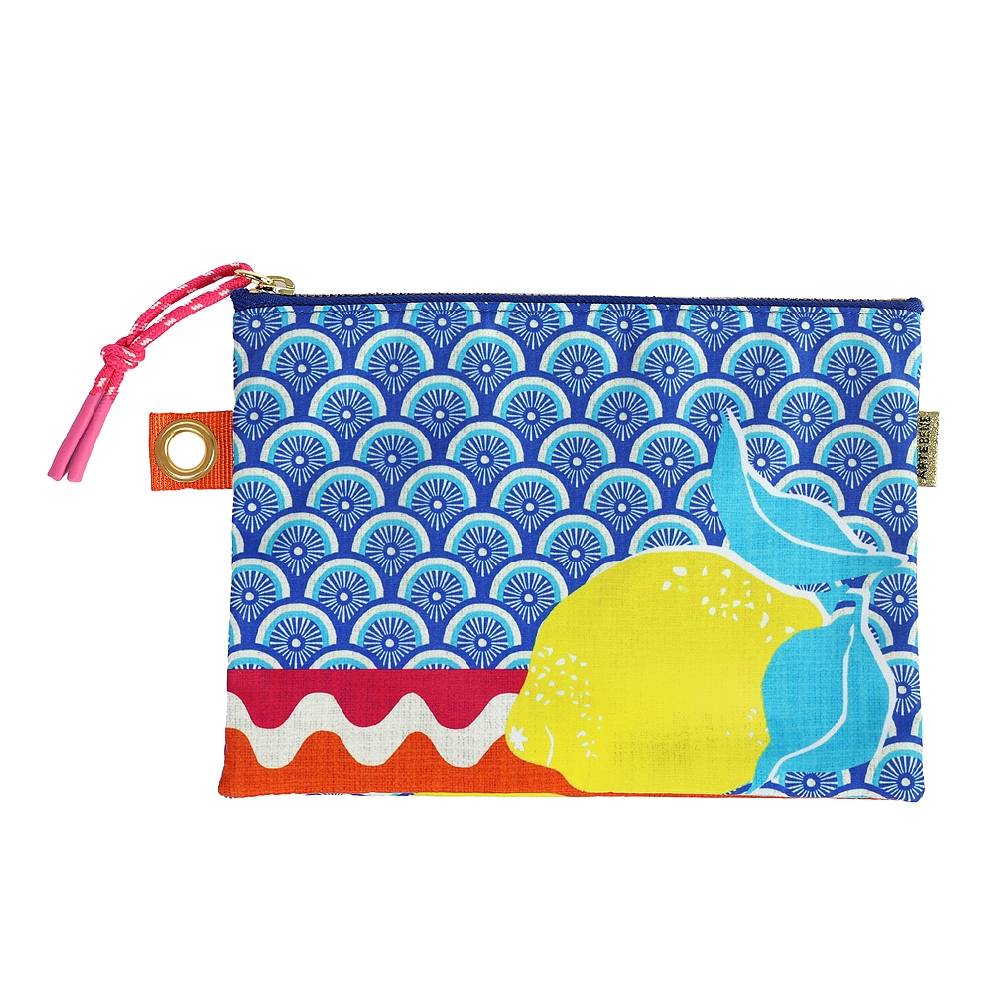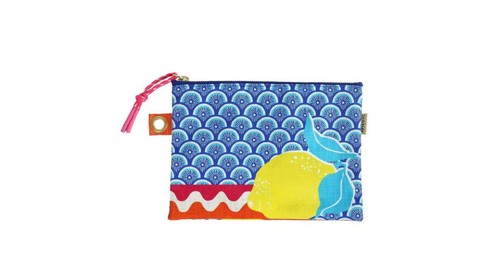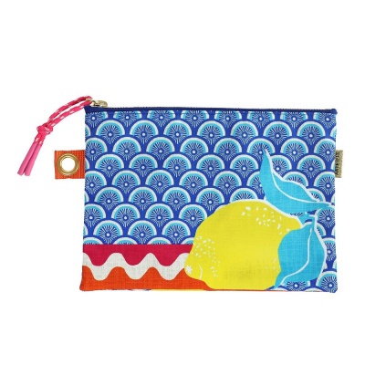 Ennek a trendi neszesszernek az élénk sárga citrom, a türkiz levelek, a kék hullámminta és a piros díszítések kombinációja nyári hangulatot és vidámságot kölcsönöz.