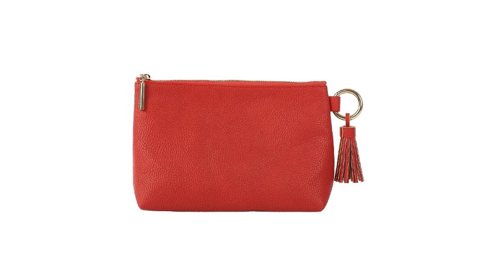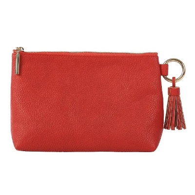 - Merész, piros színű, nubuk bőr hatású neszesszer arany színű karikával és bojt díszítéssel