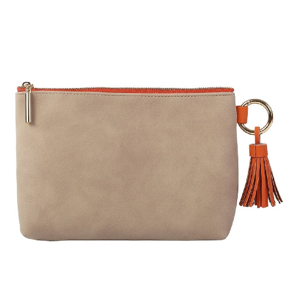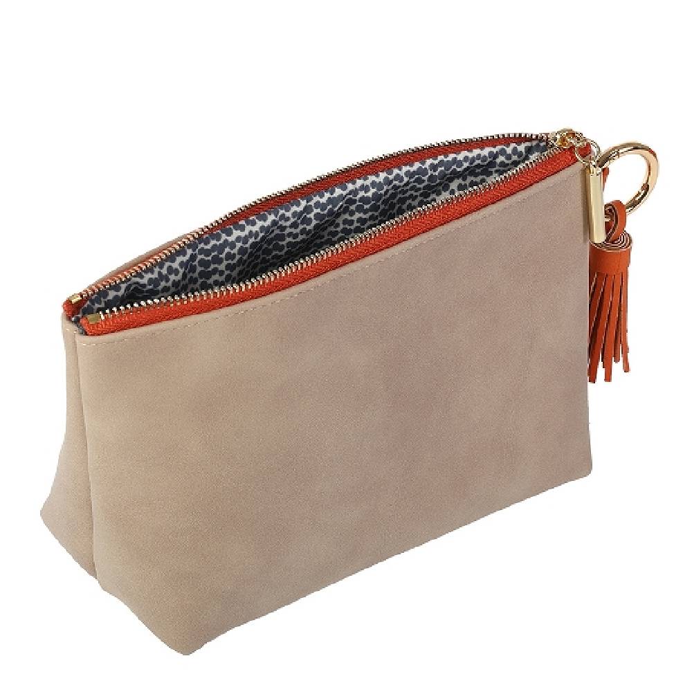 - Stílusos, taupe-narancs színű, nubuk bőr hatású neszesszer arany színű karikával és dekoratív narancs bojt díszítéssel