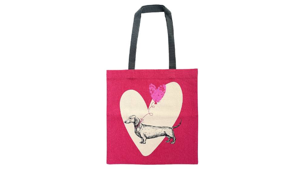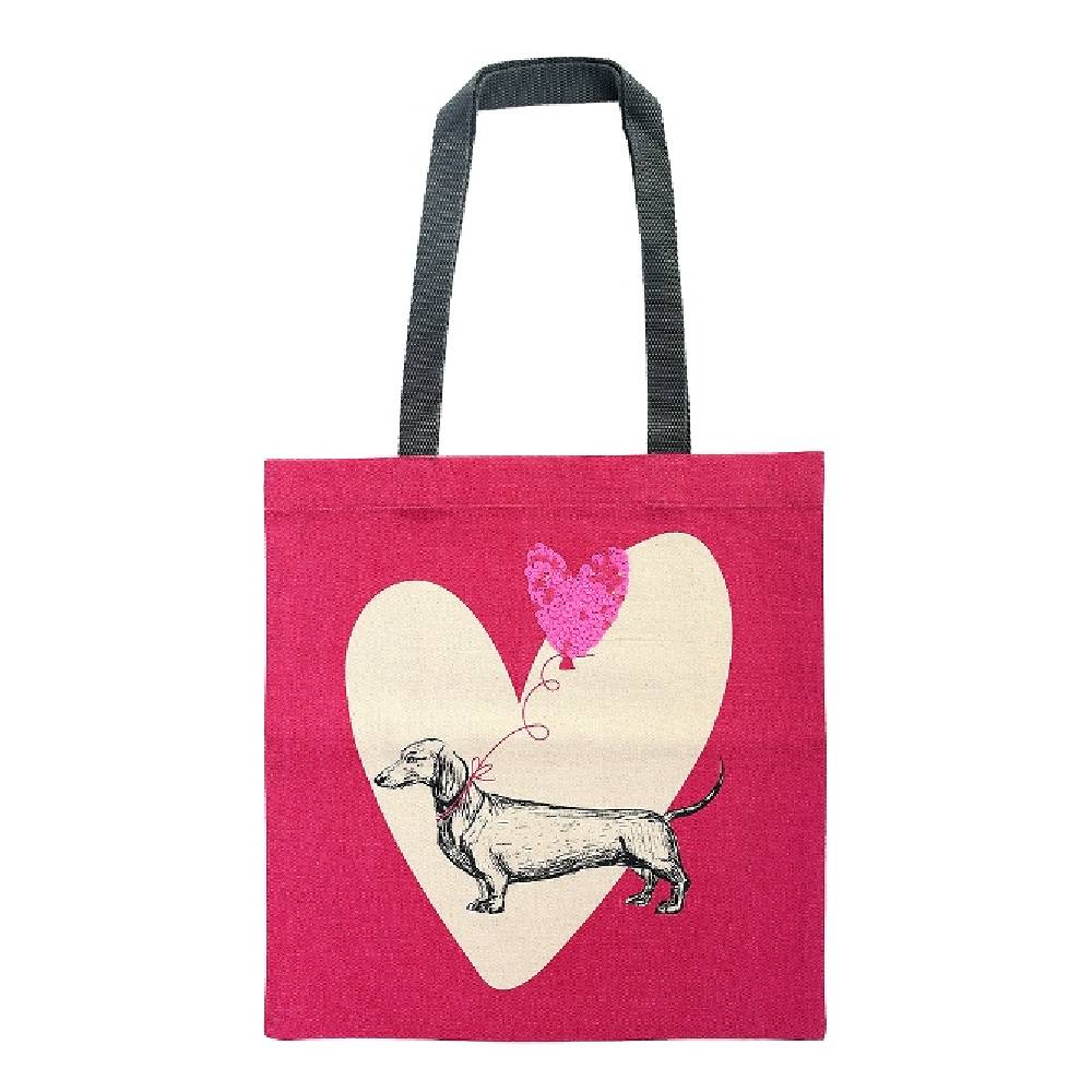 - Vidám, pink színű vászon táska natúr szív és tacskó motívummal, amely ideális választás tacskókedvelők, kutyarajongók számára