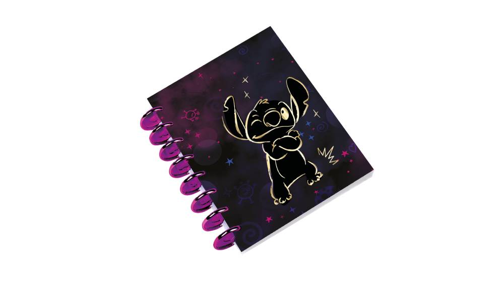 Nagy gyűrűs, lila színű spirál notesz borítóján Stitch grafikával