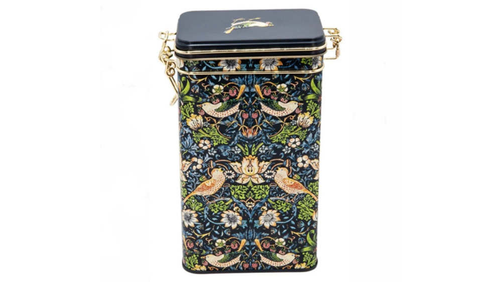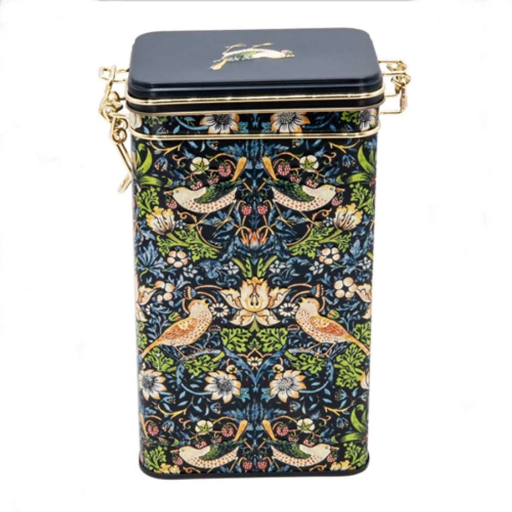 Csatos konyhai fém tároló doboz, dombornyomott, William Morris - The Strawberry Thief c. alkotásával