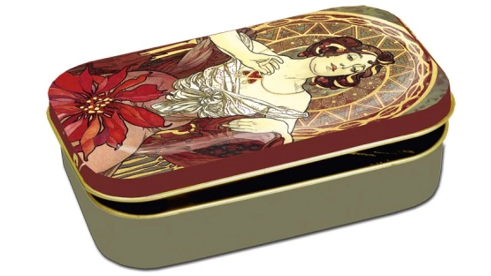 Fémdoboz 10x2x6,2cm, Mucha JacquelineKisméretű fémdoboz felnyitható tetővel, melyen Alfons Mucha - Jacqueline c. festménye látható. Mérete: 10 x 2 x 6,2 cm.