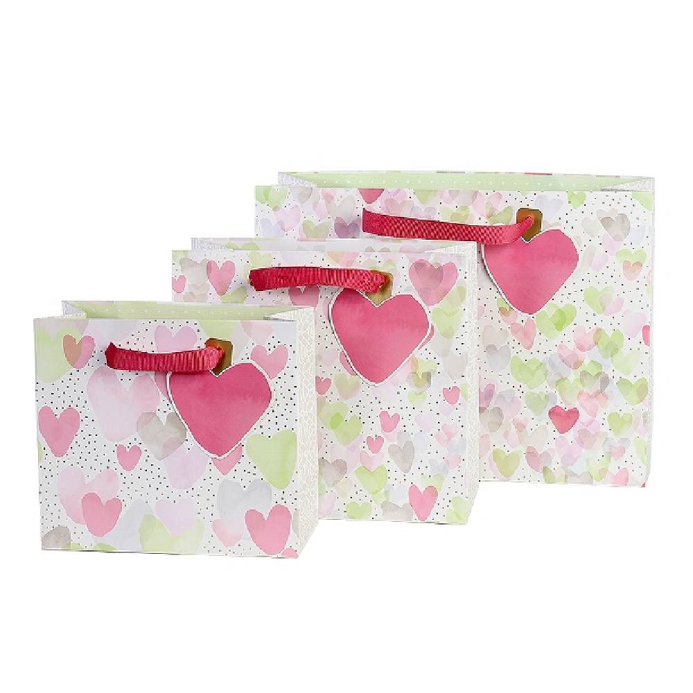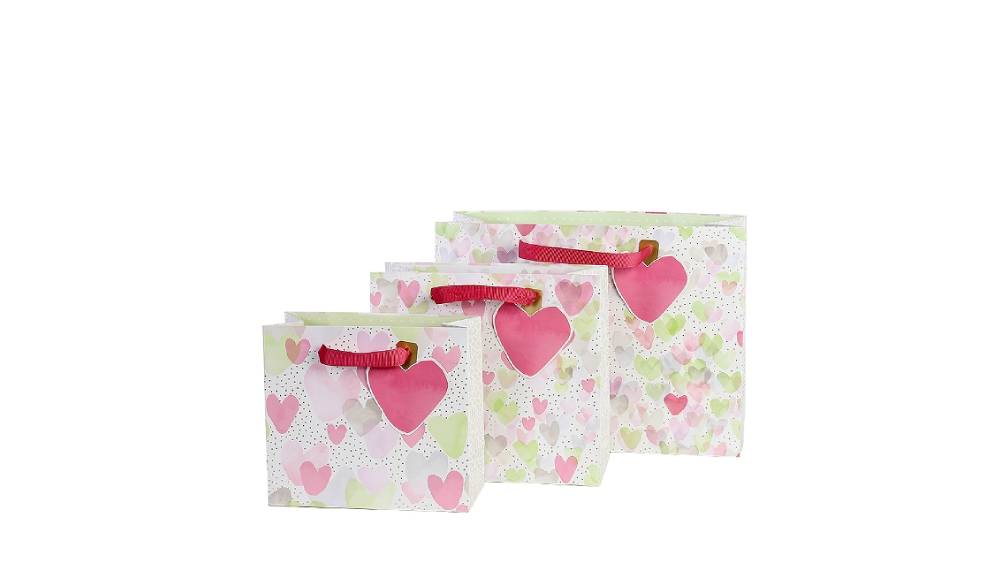 - Kellemes, pasztell színekkel, finom szív mintákkal készült ajándéktasak
