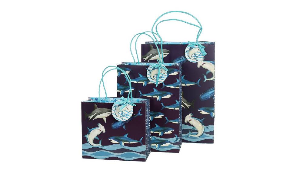 Menő és egyedi – ez az ajándéktasak sötét háttér előtt cápa mintákkal nyűgöz le.