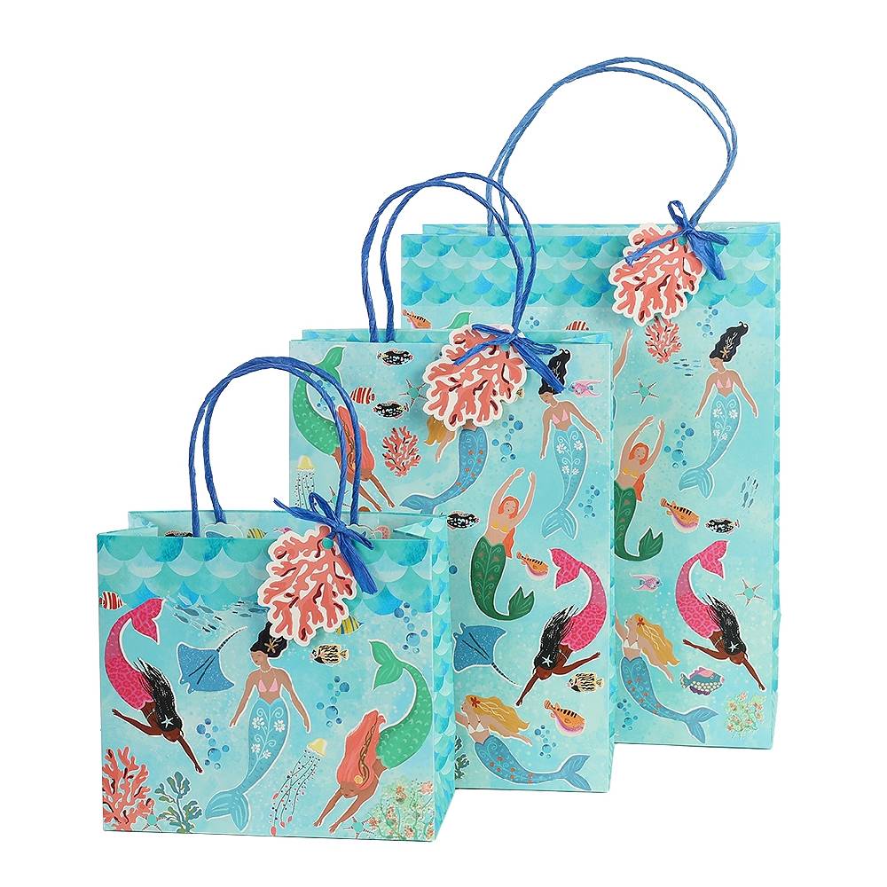 A masszív kék zsinórfogantyúk és a hozzá illő óceán témájú ajándékcímke teszi praktikussá és dekoratívvá az ajándéktasakot.
