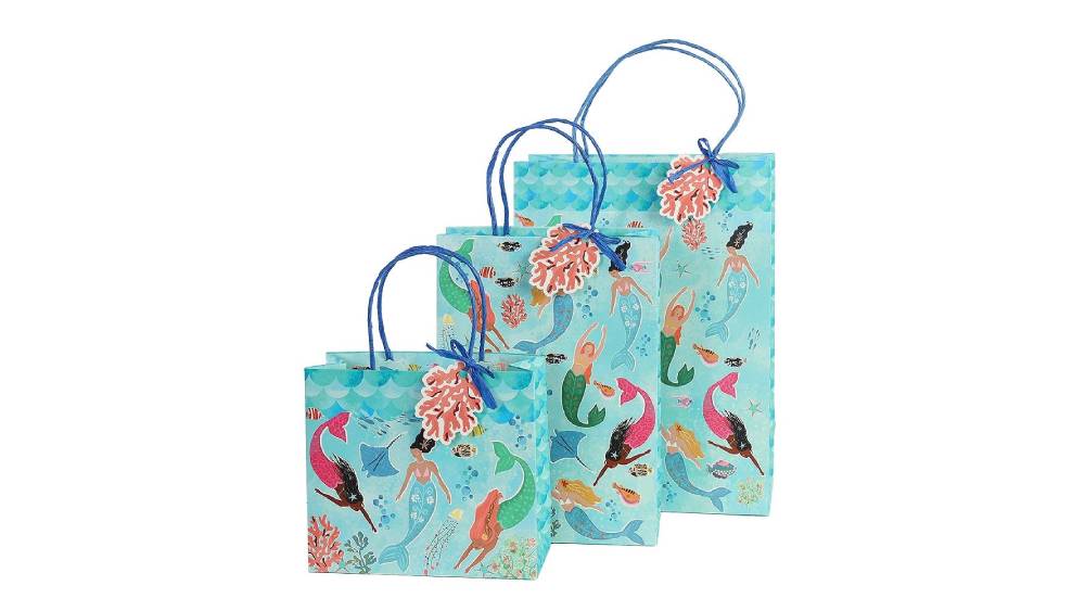 Varázslatos, játékos és színes – ez az ajándéktasak türkiz alapon sellő mintákkal varázsol el.