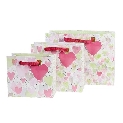- Kellemes, pasztell színekkel, finom szív mintákkal készült ajándéktasak