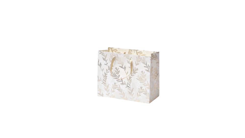 - Golden Glow aranyfényű ajándéktasak, elegáns, bézs, arany fenyőágas mintával