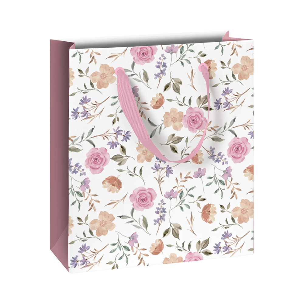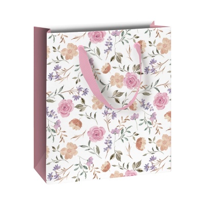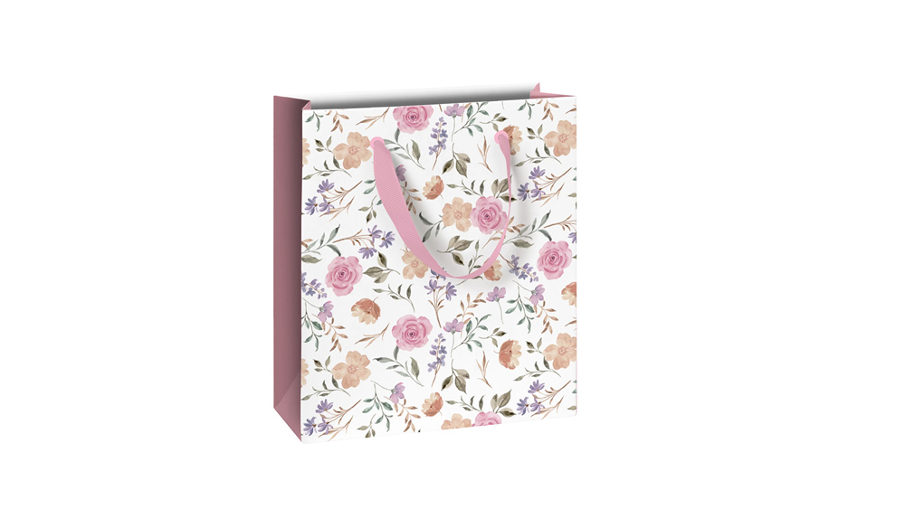 A Flowers termékcsaládhoz tartozó ajándéktasakokon fehér alapon finom pasztellszínű virágminták láthatók.
