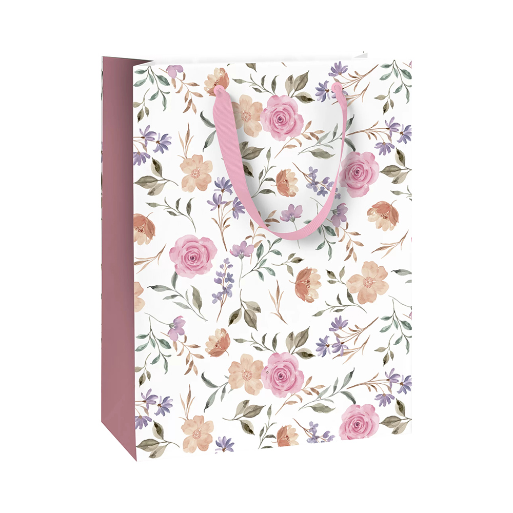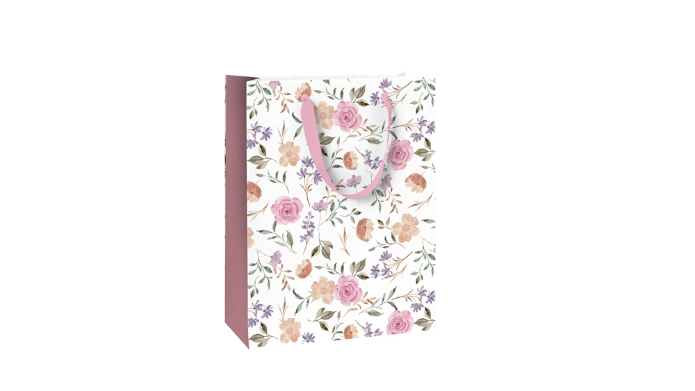 A Flowers termékcsaládhoz tartozó ajándéktasakokon fehér alapon finom pasztellszínű virágminták láthatók.