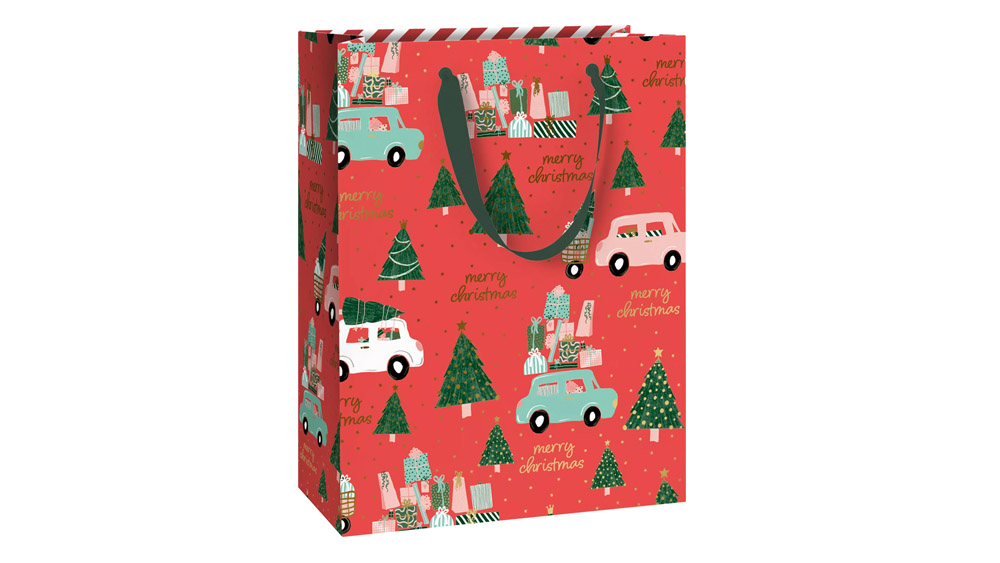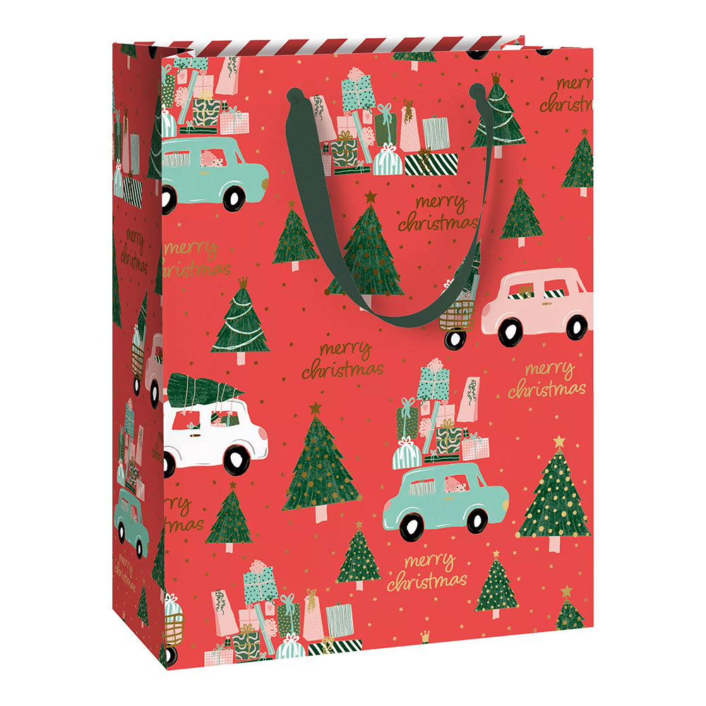 Stewo ajándéktasak, 23x13x30 cm, kraft, piros autós, Anette, karácsonyi