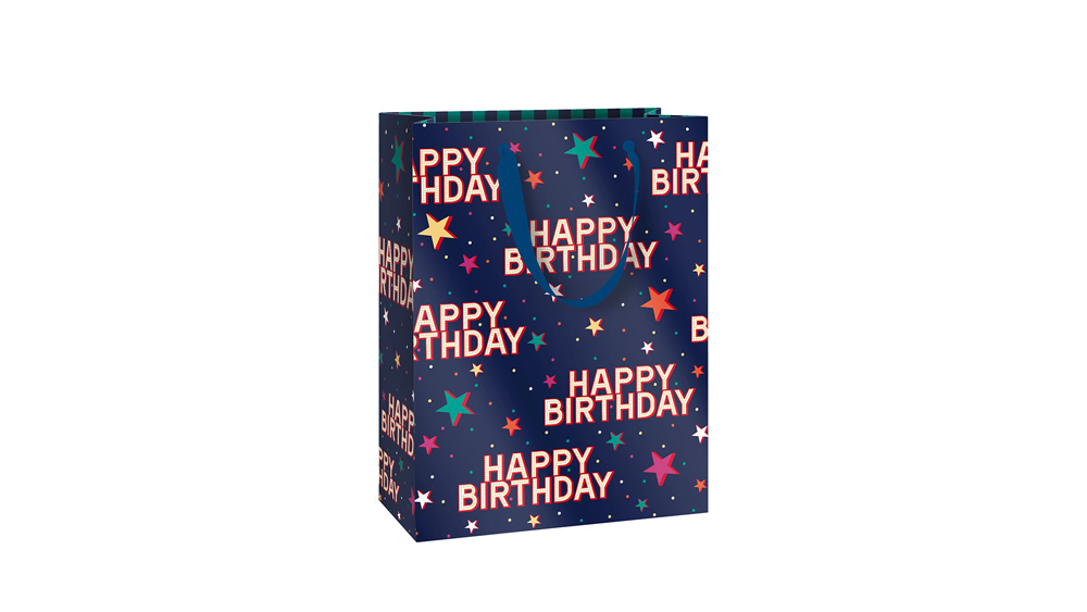 Stewo ajándéktasak, 23x13x30 cm, sötétkék, csillagos, Happy Birthday, Starlett