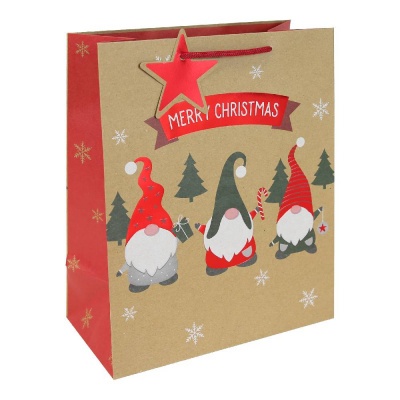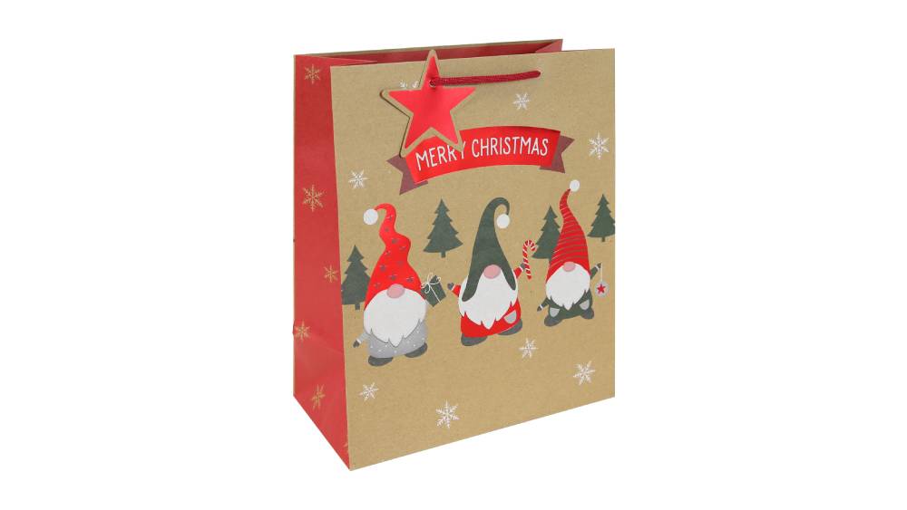 - Hangulatos, természetes kraft papírból készült ajándéktasak, kedves karácsonyi manó mintával