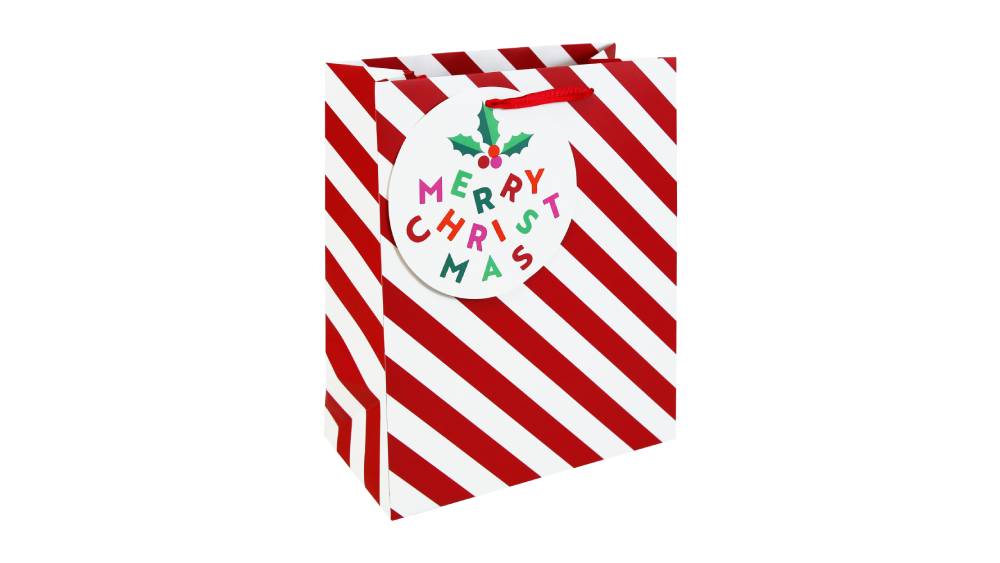 - Letisztult, piros-fehér, átlós csíkozású ajándéktasak, amely vidám, karácsonyi cukorpálca-hangulatot idéz