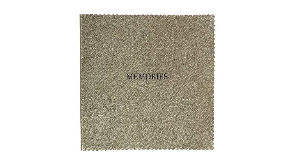 - Elegáns, óarany borítású vendégkönyv „Memories” felirattal, amely stílusos választás esküvőkre és különleges alkalmakra