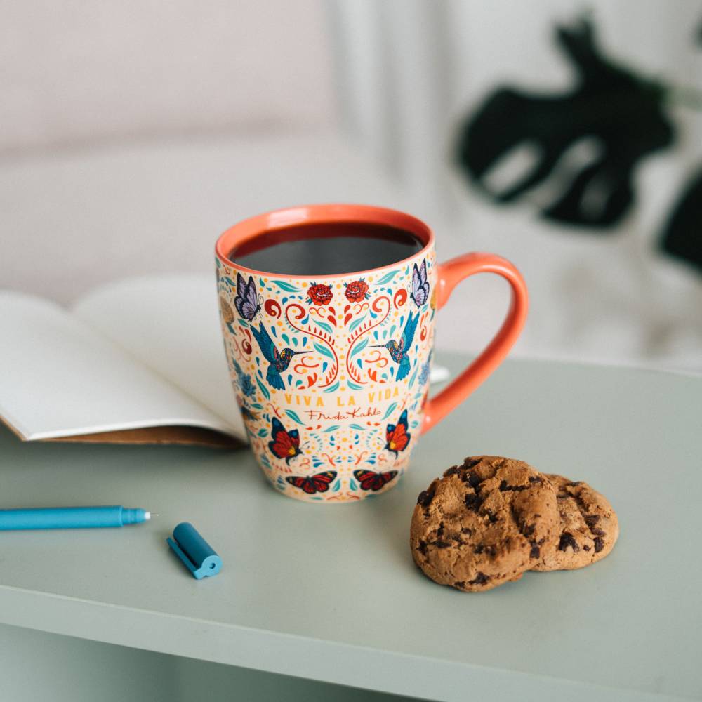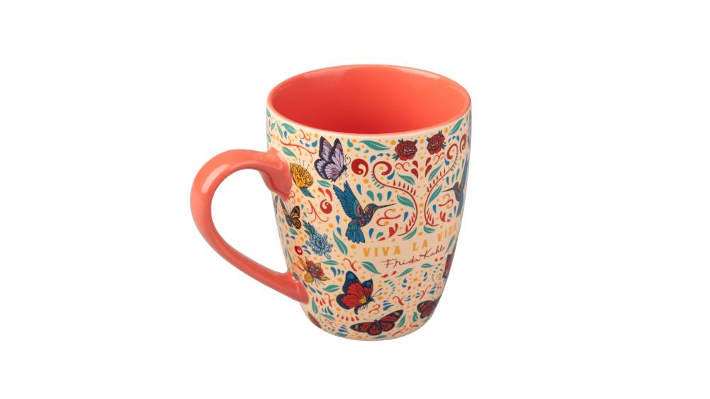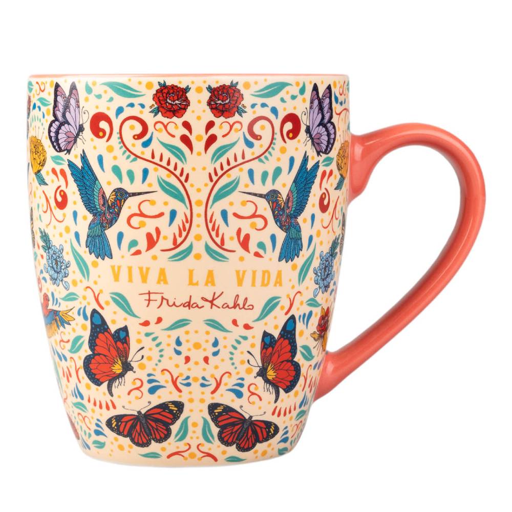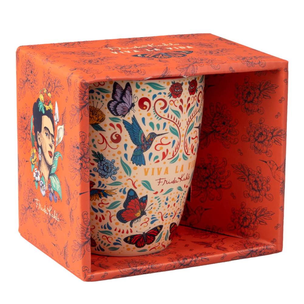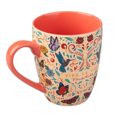 - Ez a gyönyörű Frida Kahlo bögre élénk, pillangókkal és virágokkal díszített mintával rendelkezik, amely tükrözi a művész kreatív erejét és életvidám szellemét, és „Viva la Vida” felirattal van ellátva