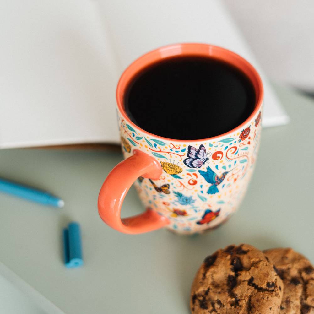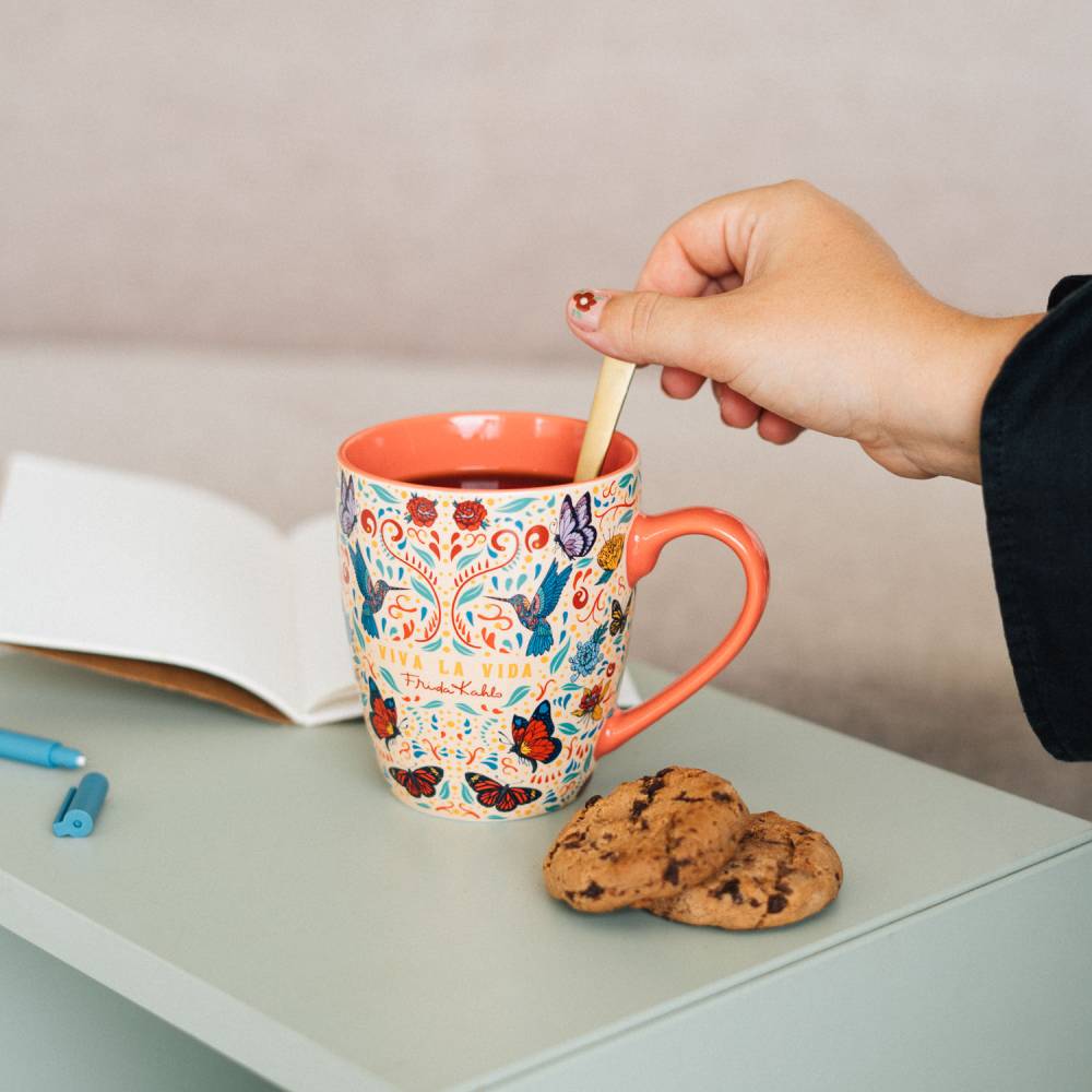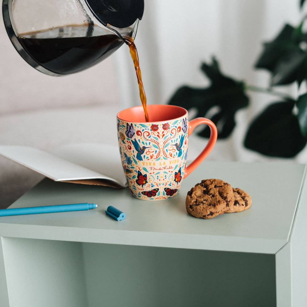 - Ez a gyönyörű Frida Kahlo bögre élénk, pillangókkal és virágokkal díszített mintával rendelkezik, amely tükrözi a művész kreatív erejét és életvidám szellemét, és „Viva la Vida” felirattal van ellátva