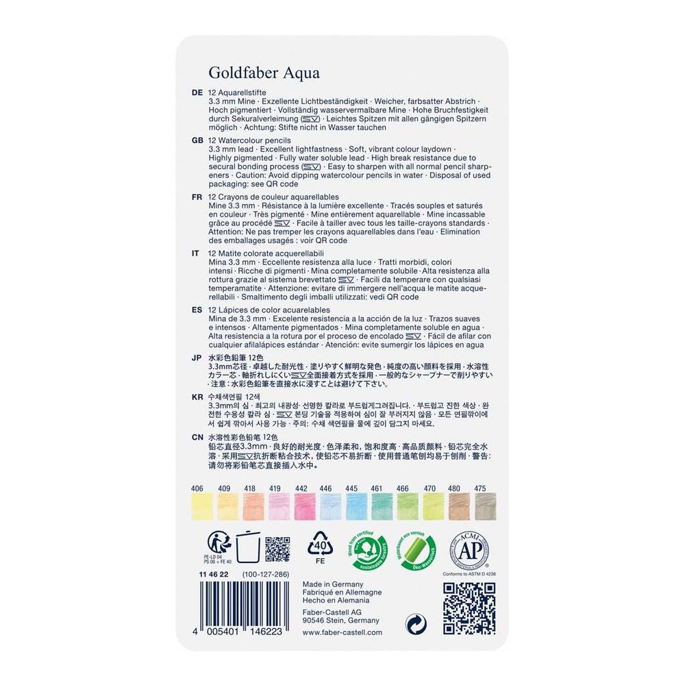 - A Goldfaber Aqua akvarell ceruza teljesen vízoldható grafitja a leginnovatívabb gyártási technológiával készült, és kiváló fényállóságával nyűgözi le a felhasználókat.