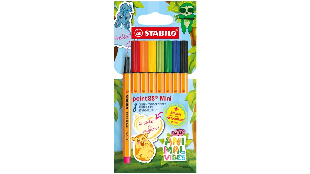 - A STABILO point 88 Mini Animal Vibes prémium minőségű készlet 8 színes mini tűfilcet és egy hozzá illő matricát tartalmaz, amelyet a mellékelt tollakkal személyre lehet szabni