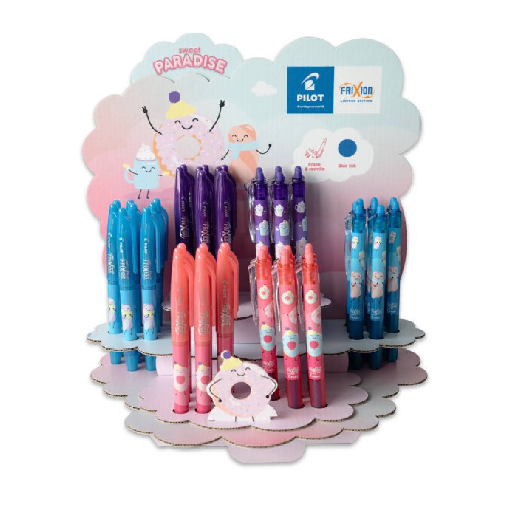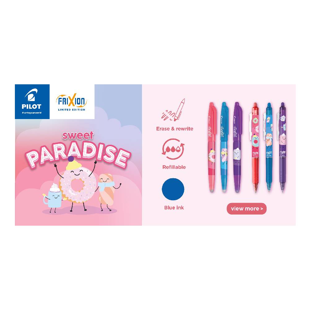 A Pilot limitált kiadású Sweet Paradise Frixion Clicker vidám, színes motívumokkal díszített tollaival könnyű az írás.