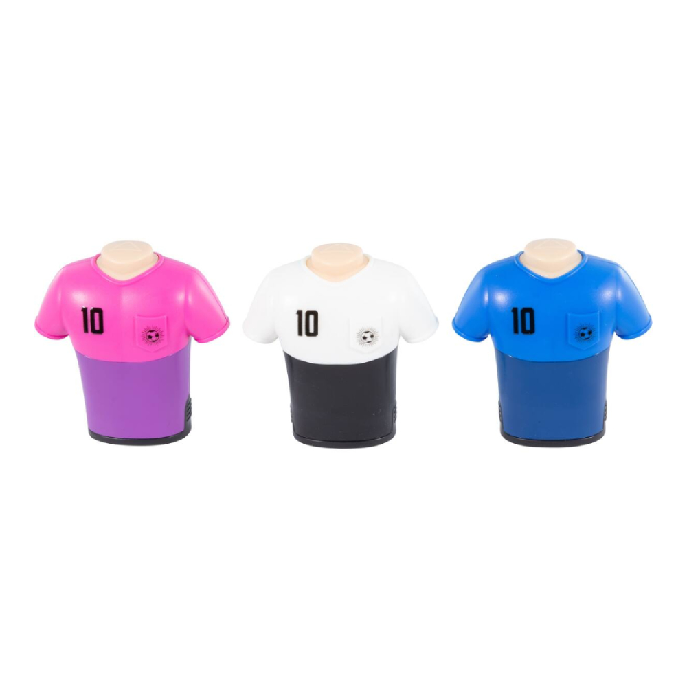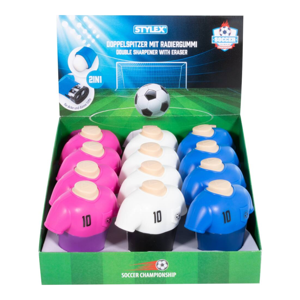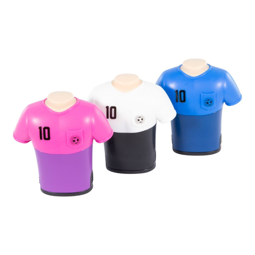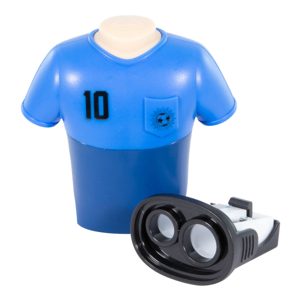 Kötelező darab minden futballrajongónak, kicsinek és nagynak egyaránt! Ez a praktikus, beépített radírral ellátott dupla hegyező a vagány dizájnt ötvözi a funkcionalitással. A masszív, mez megjelenésű műanyag ház igazi tekinteteket gyönyörködtetővé teszi a hegyezőt.