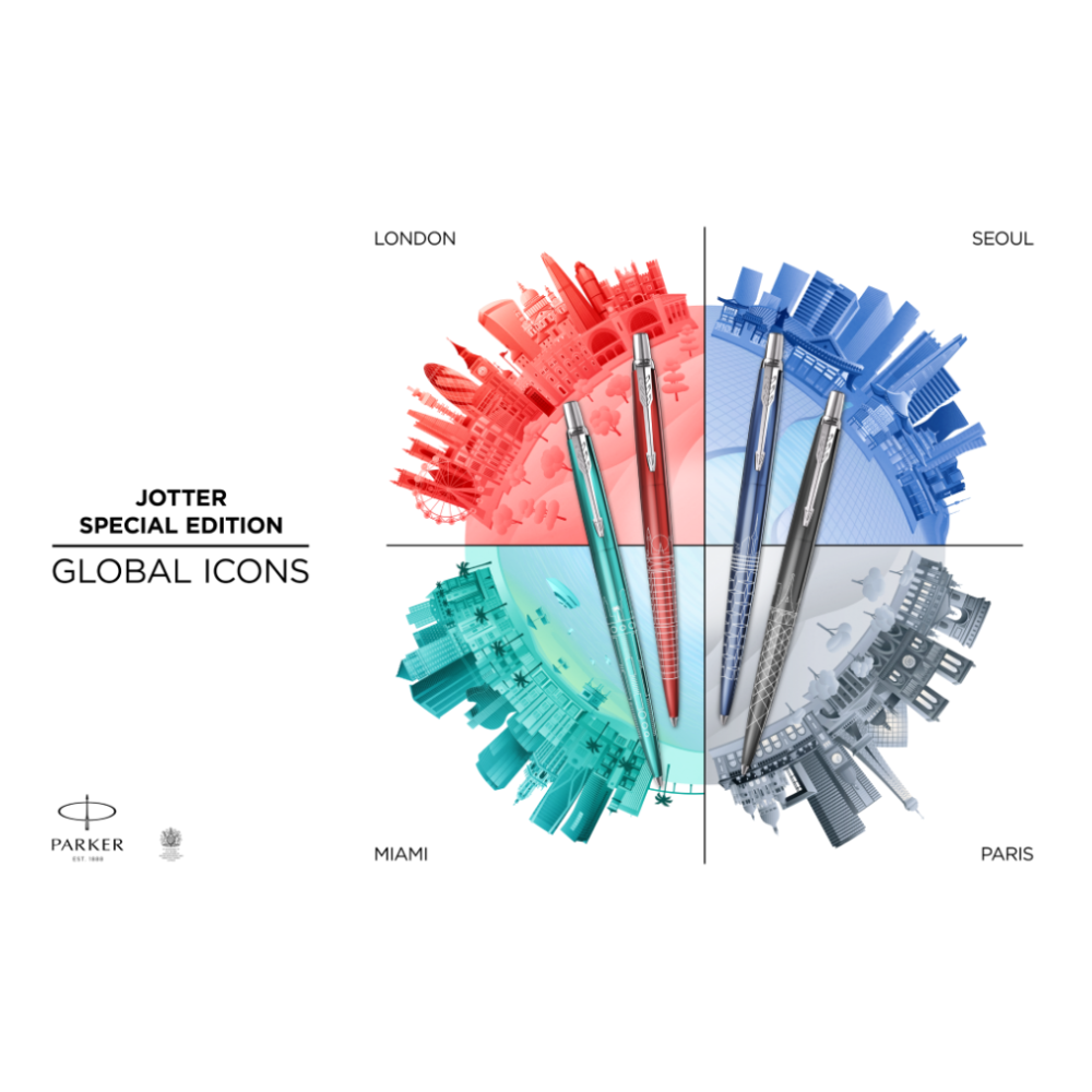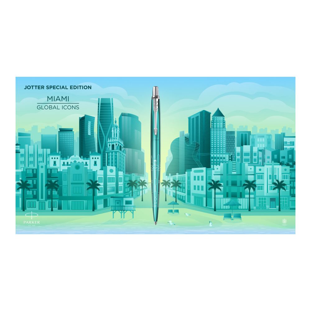A Jotter Special Edition „Global Icons” kollekció, folytatva világkörüli turnéját híres városokon keresztül, most négy új, izgalmas várost hódít meg. A Jotter Special Edition Miami ihletét a vibráló Art Deco épületek, a merész geometrikus formák és a város játékos, színes karaktere adja. A dizájn az ikonikus Ocean Drive homlokzataira és a vidám, élettel teli részletekre épül, melyek Miami sajátos hangulatát tükrözik, és a toll testén is megjelennek.
