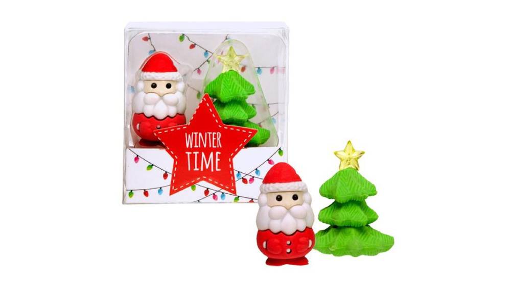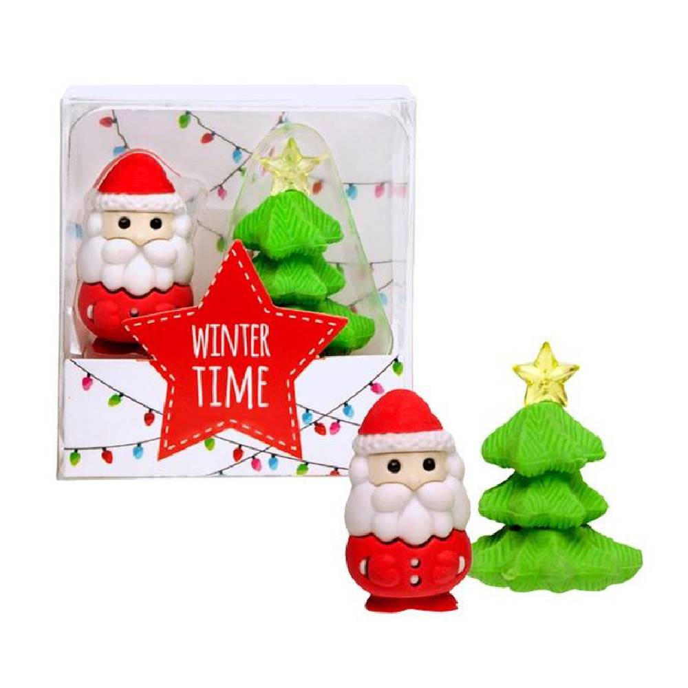 A 2 darabos radírcsomag egy mikulást és egy karácsonyfát formázó radírból áll