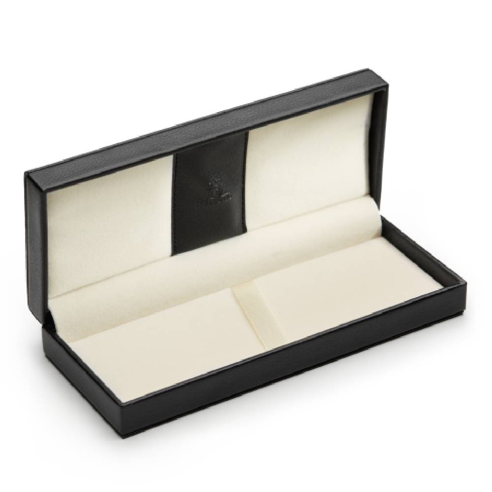 - A doboz önzáró mechanizmussal rendelkezik, a belsejében a tollat rögzítő pánttal és puha párnával van ellátva; a toll, a tanúsítvány, a bőr tok, a három tintapatron és a konverter tökéletesen elfér benne