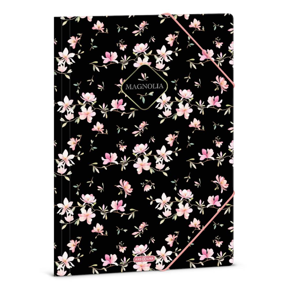 - A/4 méretű gumis dosszié borítóján virágos grafikával iratok, füzetek tárolására