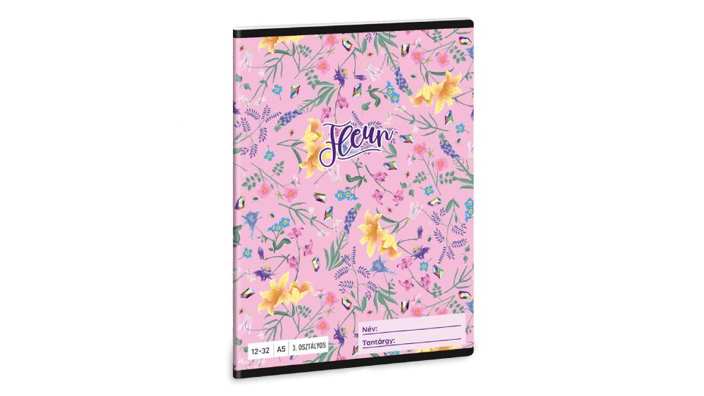 Vonalas füzet harmadikosoknak, borítóját pasztell rózsaszín alapon virágminták jellemzik