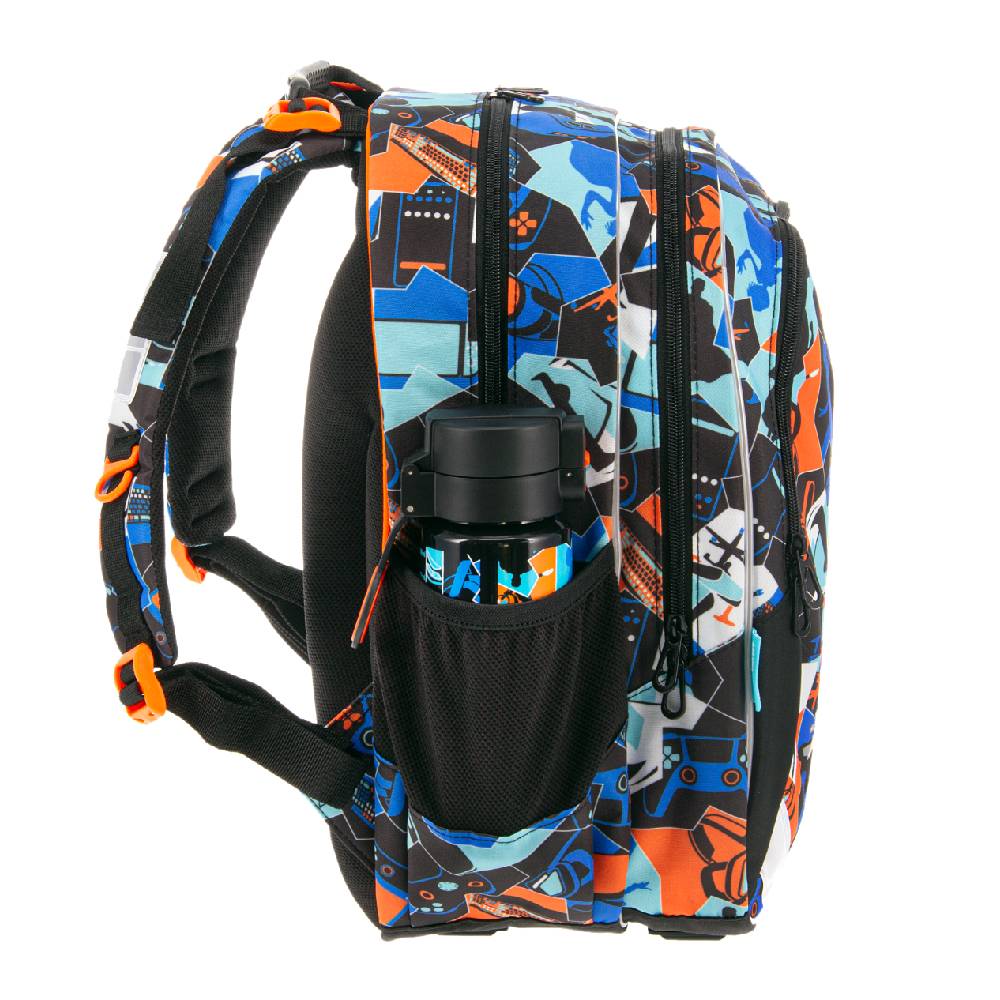 - Két oldalán egy-egy gumis zsebben kulacs és esernyő tárolható