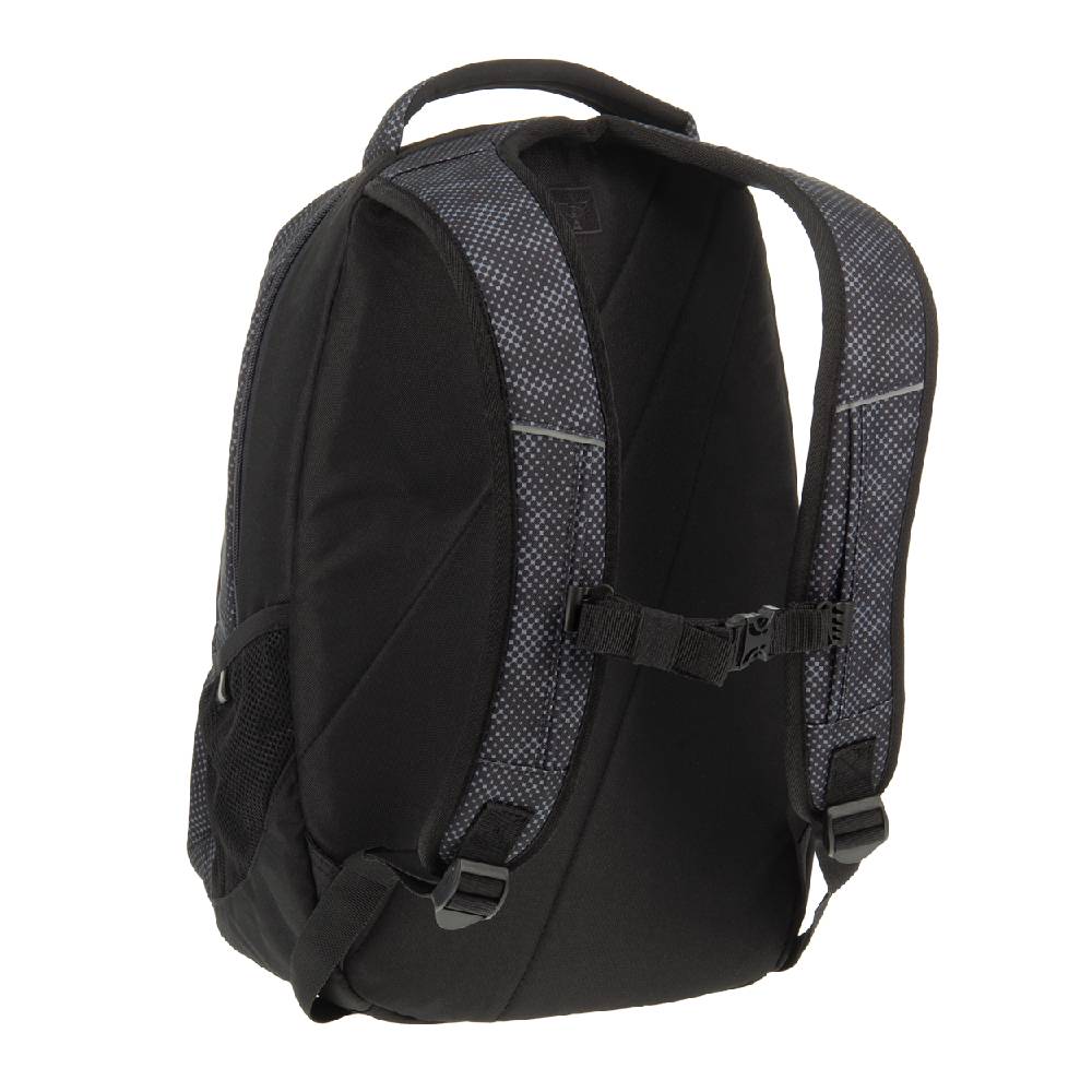 - Hátizsák fekete színben, visszafogott mintával, tetején fogantyúval