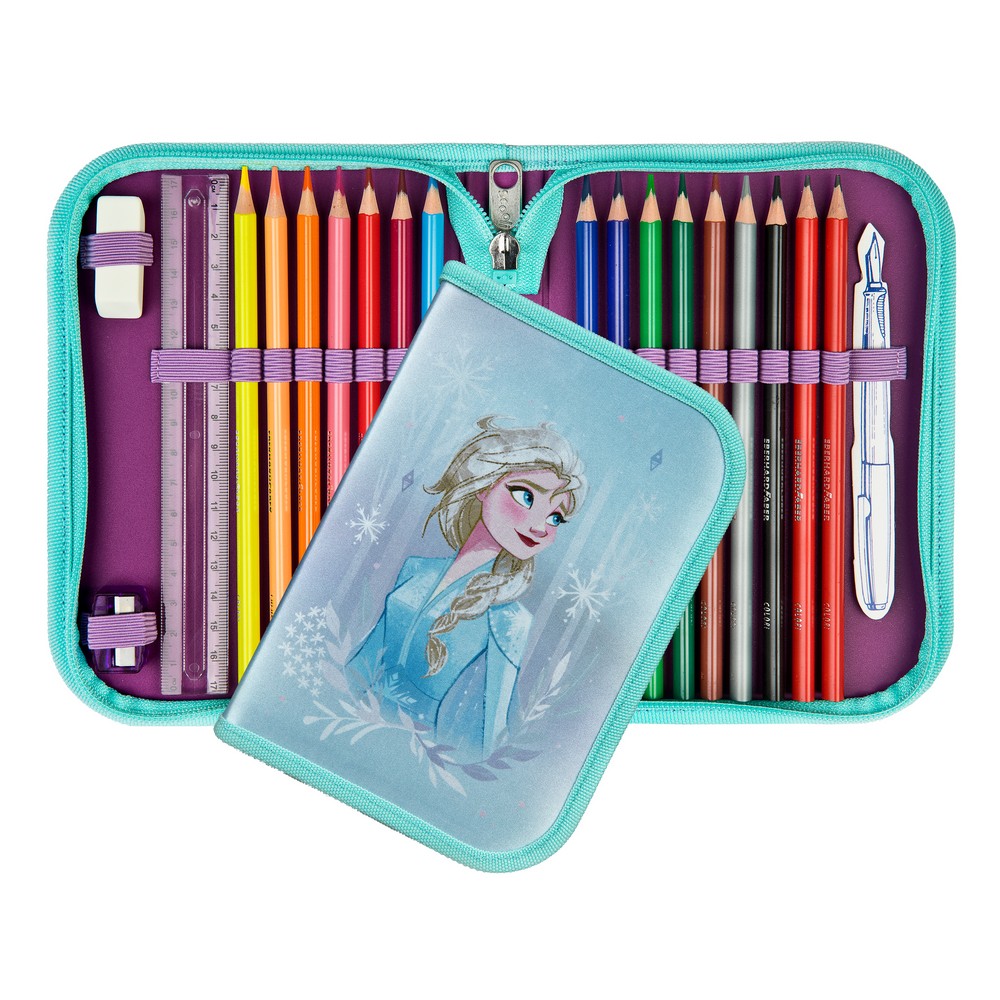 A táska motívumvilágával megegyező tornazsák, töltött tolltartó (Eberhard Faber termékekkel felszerelve), ceruzatartó és kulcstartó egész biztos, hogy Jégvarázs kis rajongóinak kedvence lesz!