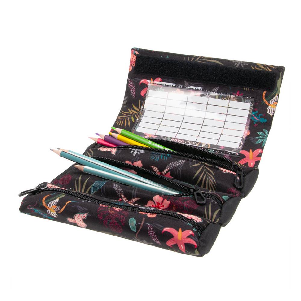 - Minden írószered egy helyen lehet ebben a gyönyörű, trópusi virágmintával díszített feltekerhető tolltartóban