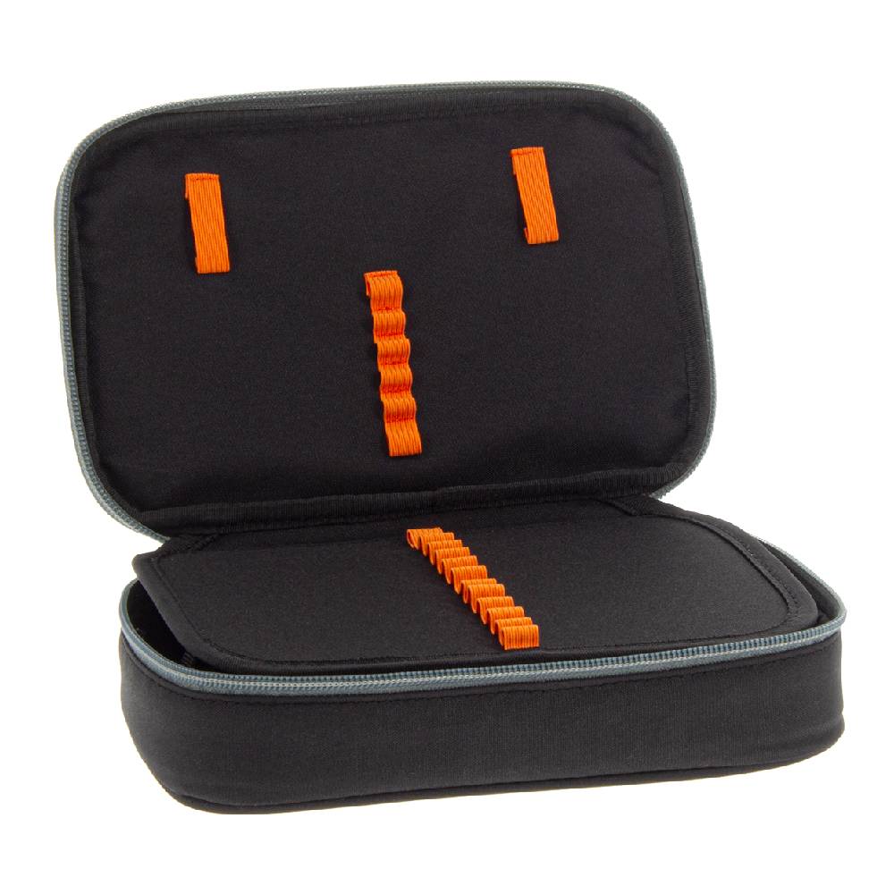 - Belül textillel bevont merev lapokkal, gumis kialakítással 30 ceruza számára az írószerek tárolásához és egy cipzáras belső zsebbel