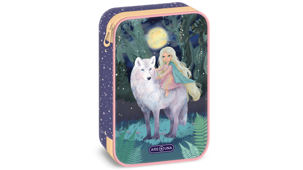 Farkasos grafikával díszített, többszintes, töltetlen, cipzáras tolltartó