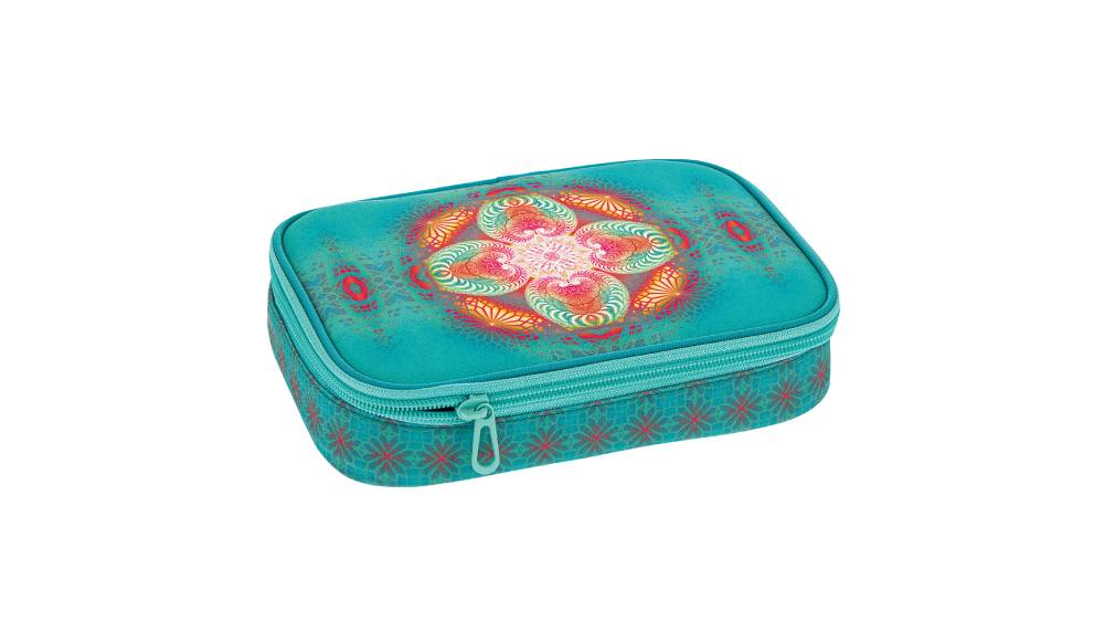 Nagyméretű, többszintes, praktikus tolltartó türkiz színű mandala mintával