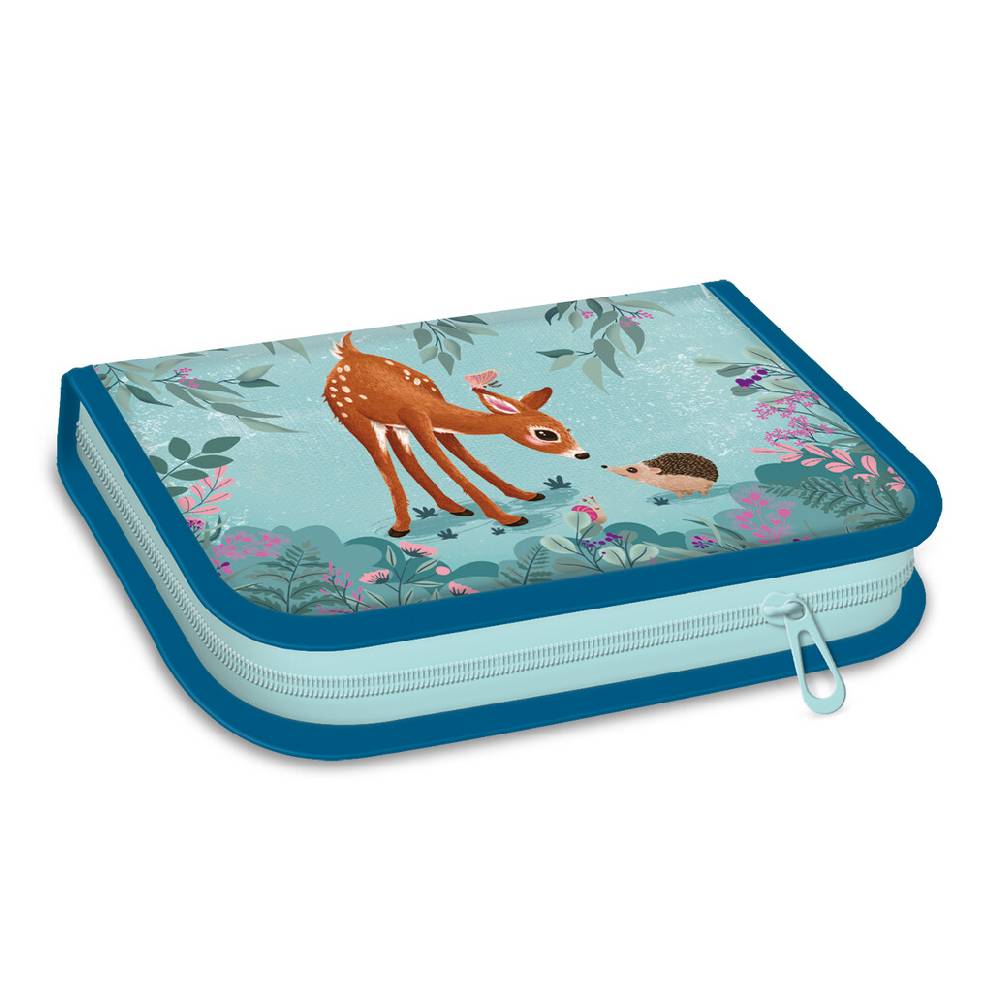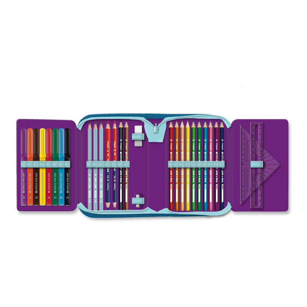 Írószerekkel töltött cipzáras tolltartó két kihajtható füllel, gumis kialakítással az írószerek tárolásához