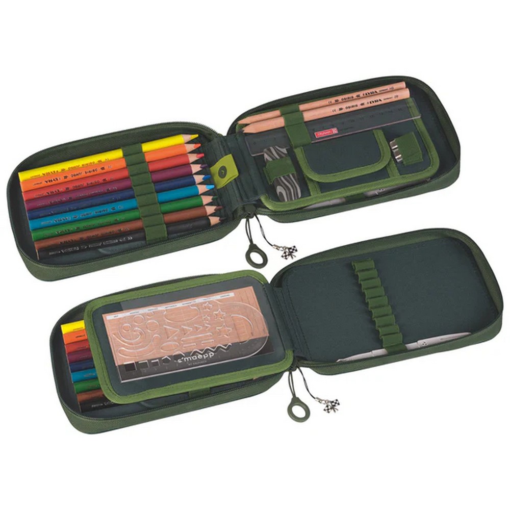 A tolltartóban jó minőségű radír, hegyező, órarend, egyenes és formavonalzó is található, illetve további írószerek (toll, filctoll, stb.) számára is van hely!