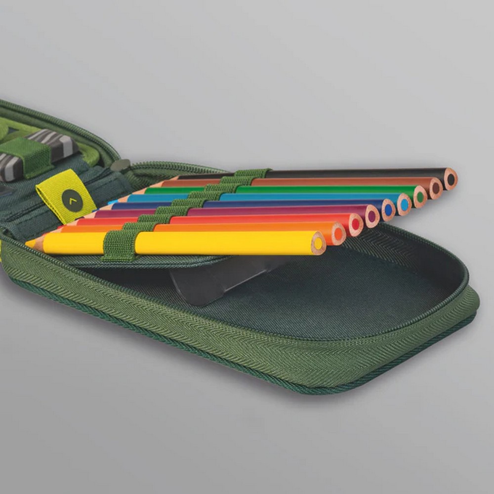 A benne lévő színes,- és grafitceruzák háromszöglegtűek, így fogásuk ideális, kényemes a gyermekek számára. A ceruzatartó rész feltámasztható, hogy a ceruzákat könnyebb legyen kivenni.