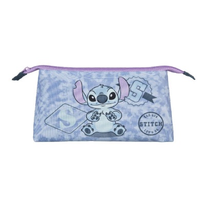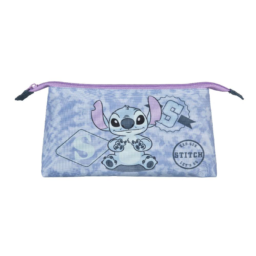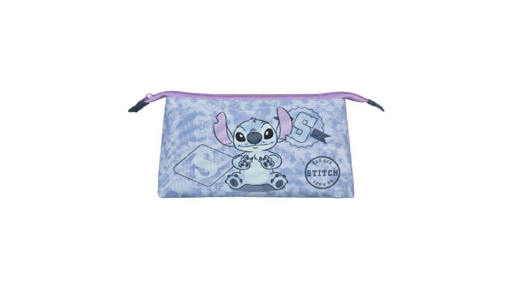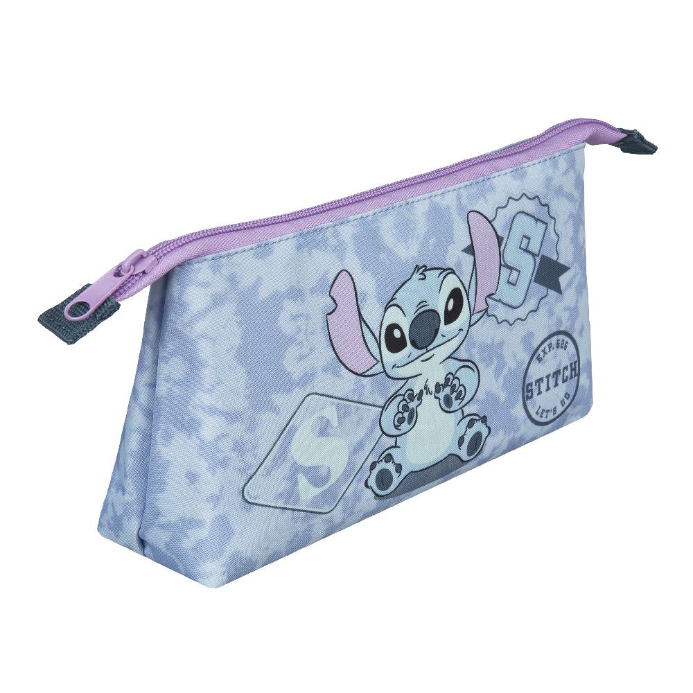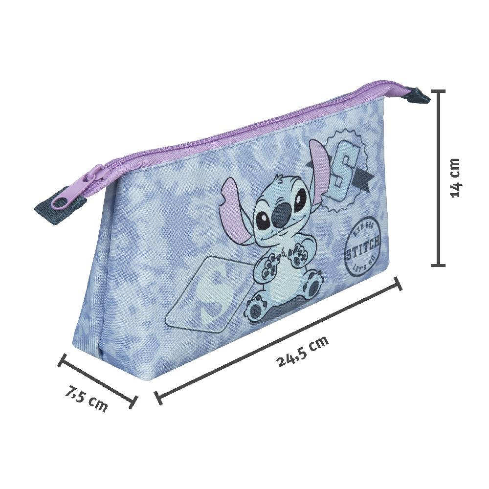 Ezt a háromszög alakú, cipzárral, kozmetikai zsebbel rendelkező táskát a népszerű Stitch figura díszíti.