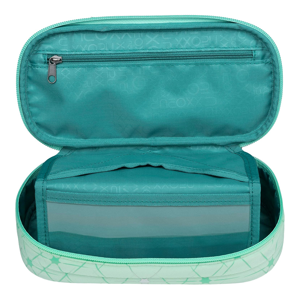 A belső elválasztó egyik oldalán ceruzák, tollak számára találsz helyet (hagyományos, gumis, bújtatós megoldás, 10 db írószernek), másik oldalán cipzáras zsebet a kisebb holmik számára. Órarendet is tettünk bele.