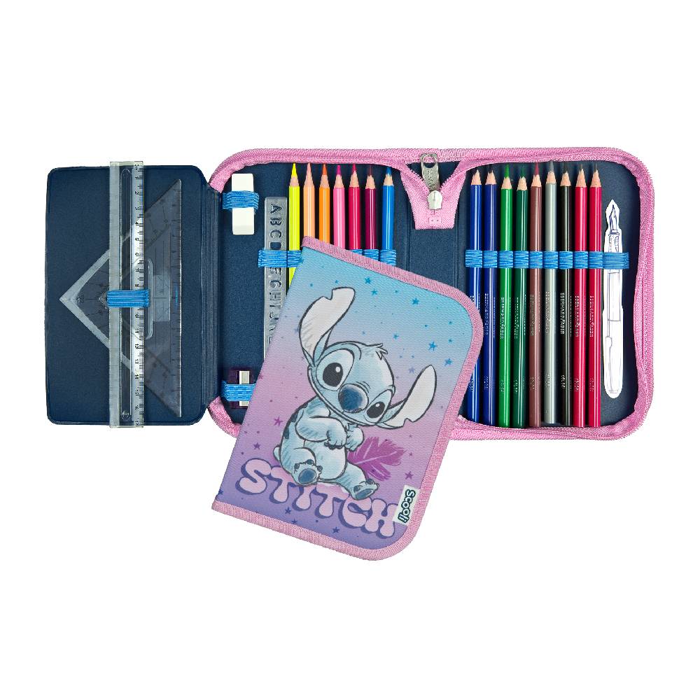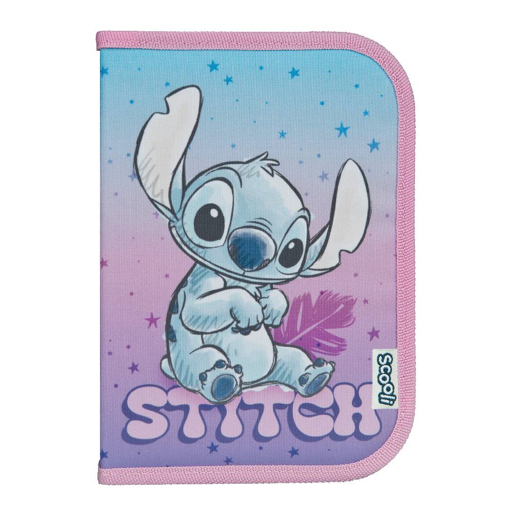 Minden megtalálható ebben a töltött, halvány lila és kék színvilágú, bájos Lilo & Stitch motívumos tolltartóban.